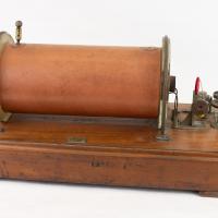 Instruments científics Patrimoni moble - Eines i equips - Electricitat i magnetisme FFUB-0113 Bobines d’autoinducció variable Bobina d'inducció Electromagnetisme Quan un corrent travessa una espira d’una bobina, a sobre apareix un flux que es transmet a les altres espires de la bobina (pel fet d’estar unides) induint-hi un corrent que s’oposa a la causa que l’ha produït. De la mateixa manera, si passat un cert temps s’ha aconseguit establir un corrent a través d’una bobina, quan es desconnecti el corrent, cada espira, davant la disminució de flux produïda pel cessament del corrent, reacciona creant una força electromotriu induïda que intenta mantenir el flux inicial. Com que de vegades interessa utilitzar bobines amb autoinducció ajustable, es construeixen bobines amb nucli desplaçable, que es pot introduir més o menys a l’interior de l’enrotllament, cosa que fa que la permeabilitat resultant es pugui variar contínuament, de manera que també es varia l’anomenat coeficient d’autoinducció. The Leeds 1890-1920 1890 1920 32 x 32 x 37 cm Llautó|Fusta|Coure (metall) Filadèlfia, EUA Facultat de Física. Martí i Franquès, 1-11, 08028 Barcelona Passadis Antic Planta 4 Desconeguda Bo Reserva (magatzem) Protegit per dret d'autor No Santiago Vallmitjana Rico, Departament de Física Aplicada, UB|Joan Manel Hernández, Departament de Física de la Matèria Condensada, UB