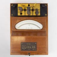 Instruments científics Patrimoni moble - Eines i equips - Electricitat i magnetisme|Patrimoni moble - Eines i equips - Mesurament FFUB-0145 Pont de Wheatstone Artefacte de mesurament d'electricitat Electromagnetisme Instrument elèctric per mesurar la resistència elèctrica dels cossos, popularitzat el 1843 per Sir Charles Wheatstone (1802-1875). S’utilitza per mesurar resistències desconegudes mitjançant l’equilibri dels braços d’un circuit en pont. Està constituït per tres resistències conegudes, una de les quals és variable. Aquestes resistències, juntament amb la resistència que es vol mesurar, formen un circuit tancat. Per efectuar la mesura, es fa variar la resistència variable fins a arribar al punt d’equilibri o detecció de corrent nul, cosa que es fa amb un galvanòmetre. H. W. Sullivan Ltd. 1920-1940 1920 1940 39,5 x 25,5 x 16,5 cm Llautó|Vidre (material)|Fusta|Baquelita Londres, Regne Unit Facultat de Física. Martí i Franquès, 1-11, 08028 Barcelona Despatx V533 Desconeguda Bo Reserva (magatzem) Protegit per dret d'autor No Santiago Vallmitjana Rico, Departament de Física Aplicada, UB|Joan Manel Hernández, Departament de Física de la Matèria Condensada, UB