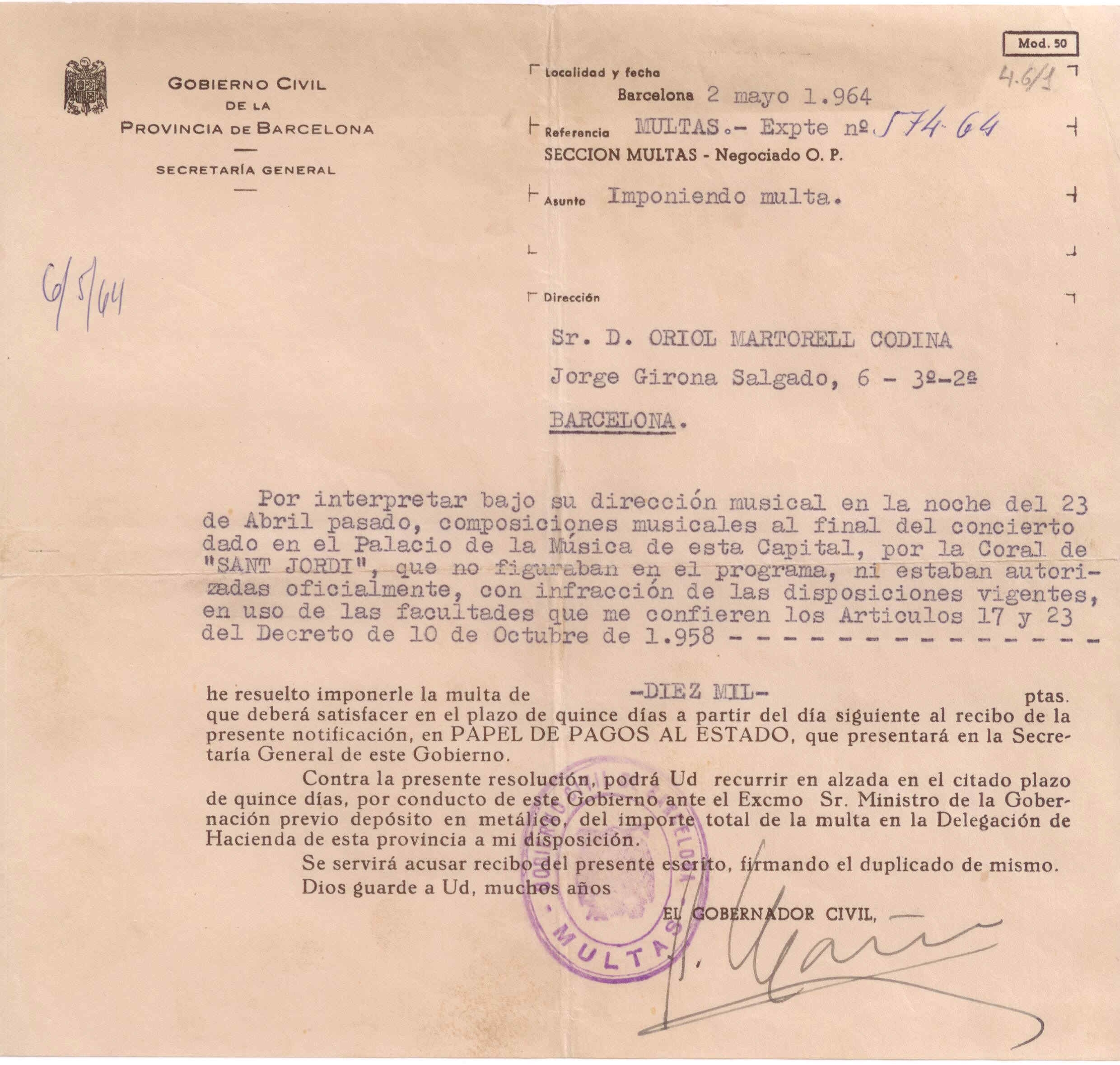 Part de Multa del Gobierno Civil de la Província per haver cantat el 23 d'abril de 1964 la peça els «Goigs de Sant Jordi»