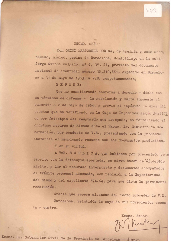 Part de Multa del Gobierno Civil de la Província per haver cantat el 23 d'abril de 1964 la peça els «Goigs de Sant Jordi»