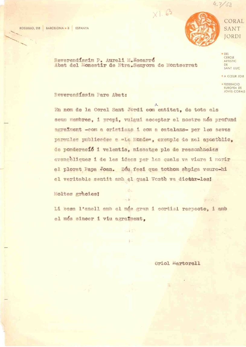 Correspondència entre Oriol Martorell i l'abat Escarré