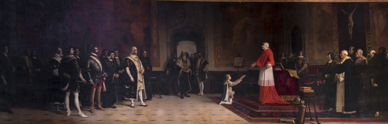 Part de El cardenal Cisneros rep un exemplar de la Bíblia Políglota, impresa a Alcalá de Henares gràcies a la seva iniciativa i direcció