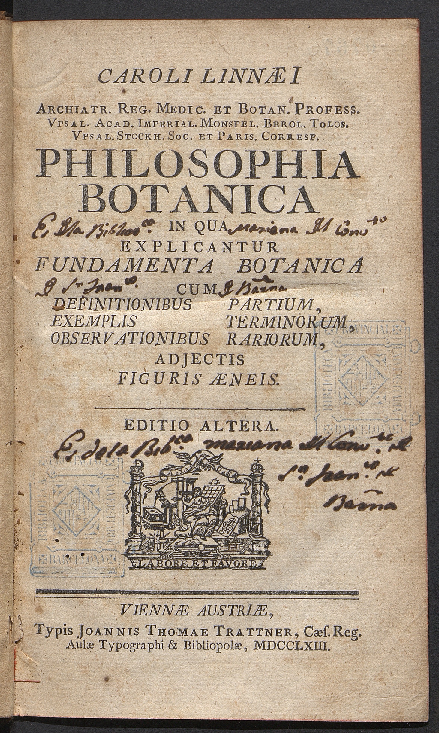Part de Caroli Linnaei ... Philosophia botanica in qua explicantur fundamenta botanica cum definitionibus partium, exemplis terminorum, observationibus rariorum, adjectis figuris aeneis