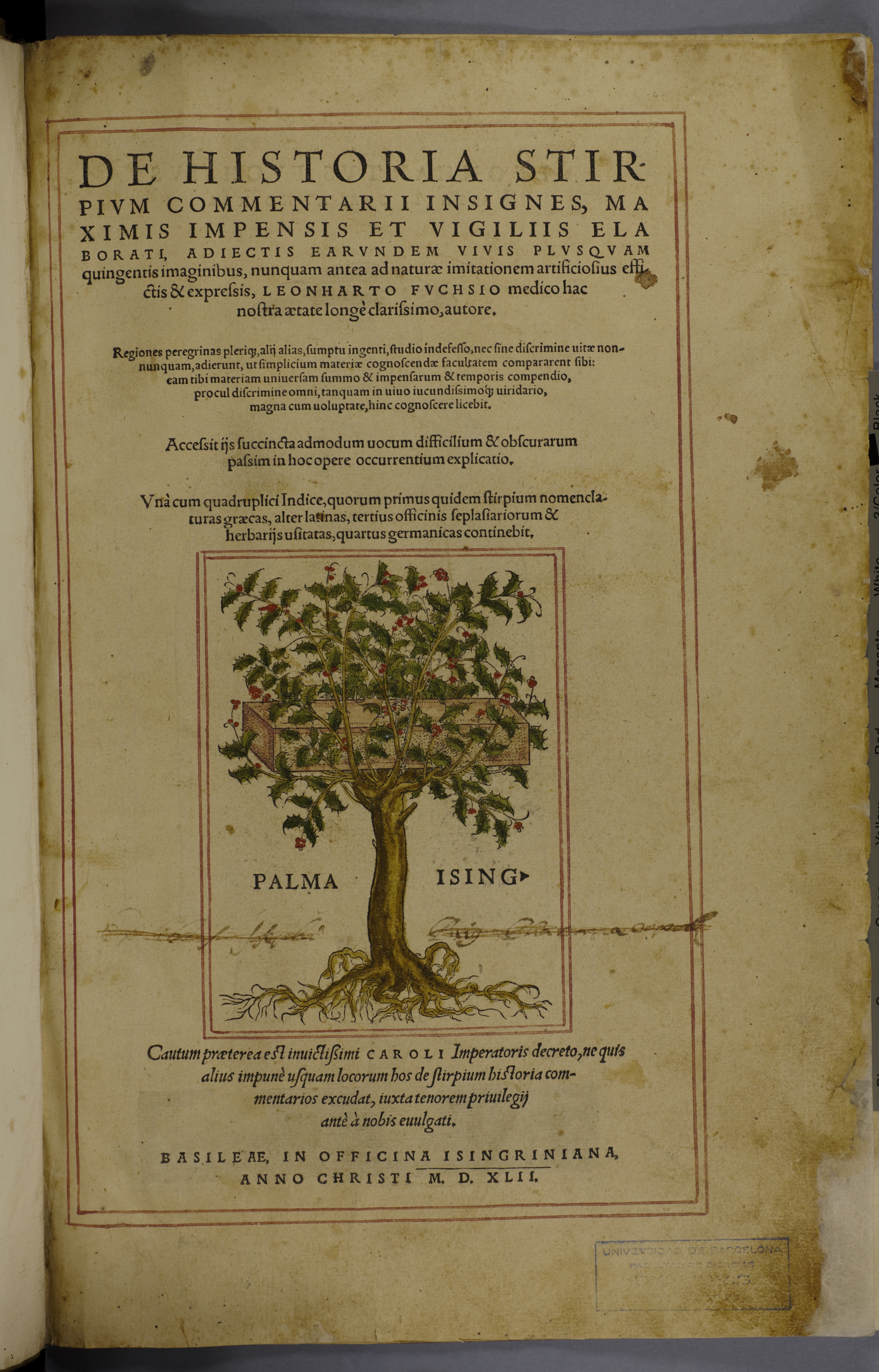 Part de De historia stirpium commentarii insignes, maximis impensis et vigiliis elaborati : adiectis earundem viuis plusquam quingentis imaginibus, nunquam antea ad naturae imitationem artificiosius effictis & expressis, Leonharto Fuchsio ... autore : regiones peregrinas pleriq[ue], alij alias, sumptu ingenti, studio indefesso, nec sine discrimine uitae nonnumquam adierunt, ut simplicium materiae cognoscendae facultatem compararent sibi, eam tibi materiam uniuersam summo & impensarum & temporis compendio, procul discrimine omni, tanquam in uiuo iucundissimoq[ue] uiridario, magna cum uoluptate, hinc cognoscere licebit : accessit ijs succinta admodum uocum difficilium & obscurarum passim in hoc opere occurrentium explicatio : vnà cum quadruplici indice ...