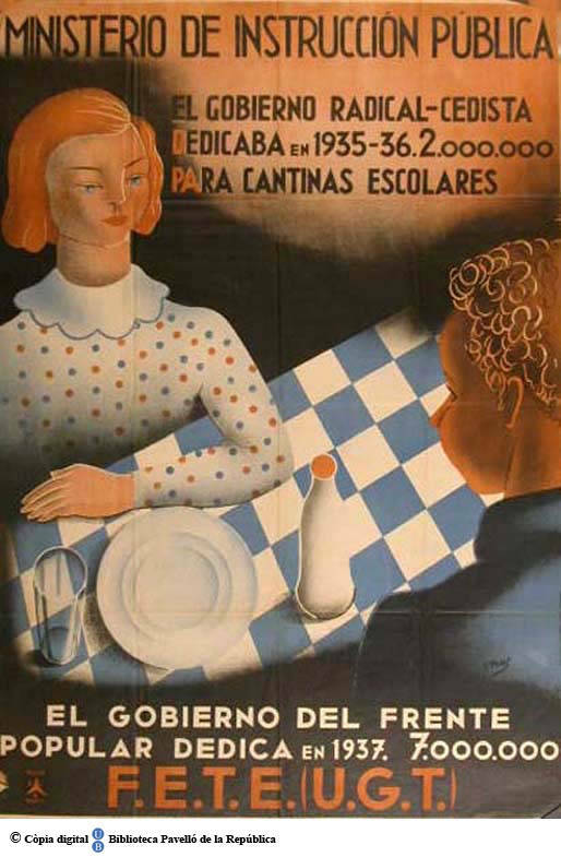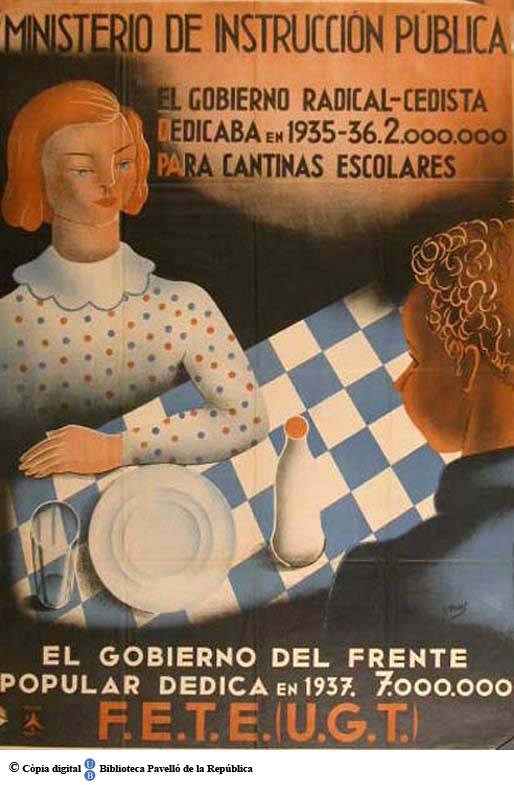 Part de El Gobierno radical-cedista dedicaba en 1935-36, 2.000.000 en cantinas escolares, el gobierno del Frente Popular dedica en 1937, 7.000.000