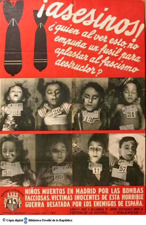 Part de ¡Asesinos! ¿Quién al ver esto, no empuña un fusil para aplastar al fascismo destructor? : niños muertos en Madrid por las bombas facciosas. Víctimas inocentes de esta horrible guerra desatada por los enemigos de España