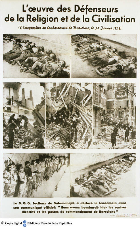 Part de L'Oeuvre des défenseurs de la religion et de la civilization : photographies de bombardement de Barcelone, le 30 janvier 1938 : le G.Q.G. factieux de Salamanque a déclaré...[etc]